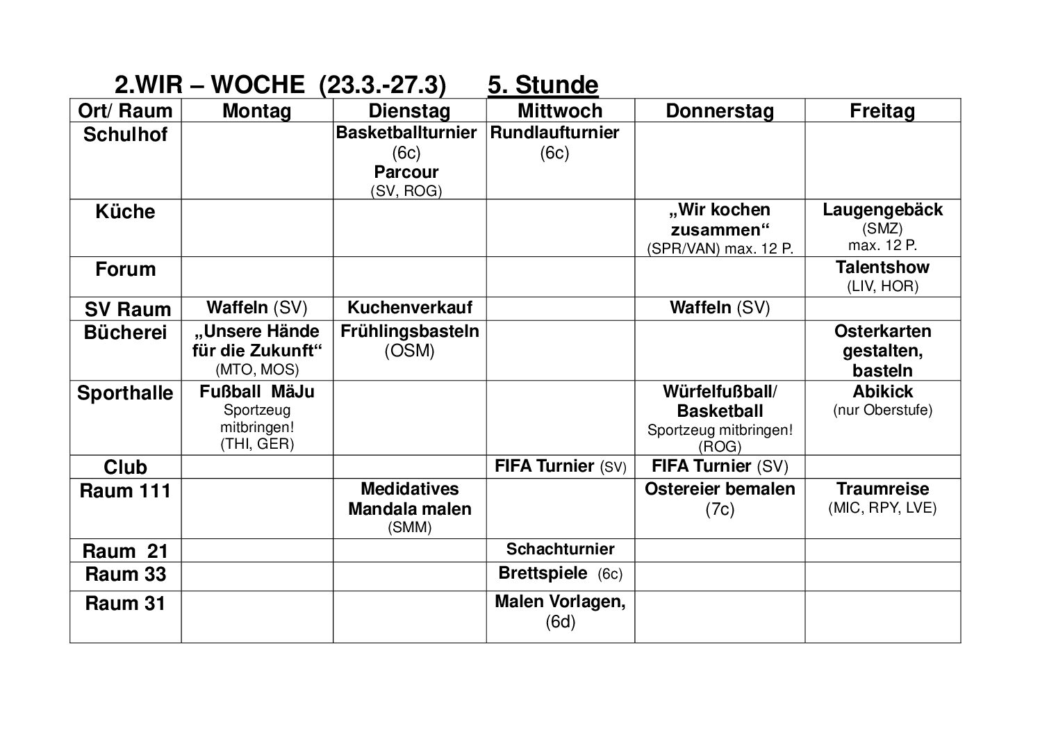 in der Woche vom 23.3.-27.3.26 findet an unserer Schule wieder unsere Wir-Woche statt. Diese besondere Woche steht dieses Mal unter dem Thema „Wir- gemeinsam Verantwortungsvoll und zuverlässig- mit Spaß und Freude“.