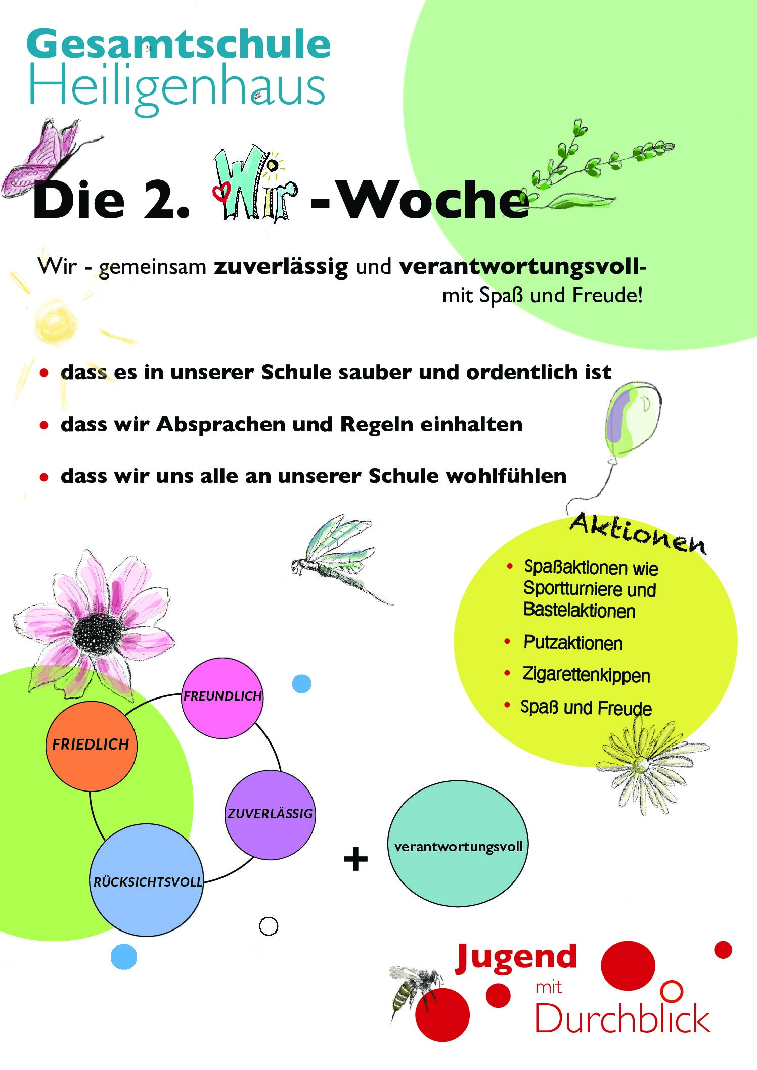 Im Mittelpunkt der Wir-Woche steht das gemeinsame Nachdenken darüber, wie wir als Schulgemeinschaft miteinander umgehen und welche Rolle Verantwortung und Zuverlässigkeit im Alltag spielen. Ziel ist es, unsere Schülerinnen und Schüler darin zu unterstützen, Verantwortung für sich selbst, für andere und für unsere Gemeinschaft zu übernehmen.