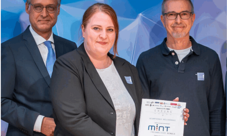 Die Urkunde nahmen die neue Didaktische Leiterin der Gesamtschule, Petra In der Smitten, und der MINT-Koordinator Markus Happel entgegen. “Wir sind sehr stolz, dass wir den herausfordernden Bewerbungs- und Prüfungsprozess erfolgreich absolviert haben”, freut sich Markus Happel. Bei der Preisverleihung wurde explizit die kontinuierliche und engagierte Arbeit des Kollegiums hervorgehoben, denn die Städtische Gesamtschule Heiligenhaus erhält das Siegel bereits zum vierten Mal.