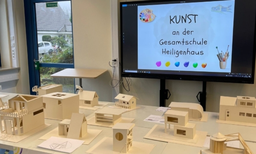 Auch im Bereich der Ausstattung verfügt die Gesamtschule Heiligenhaus über eine moderne technische Ausstattung: In allen Klassenräumen sind ActivePanels installiert, und mobile iPad-Stationen ermöglichen digitale Unterrichtsformen. Hinzu kommen neue kreative Arbeitsmöglichkeiten im eigens eingerichteten LAB/Maker-Space, der sich besonders für Projektarbeiten wie Ton- und Videoaufnahmen eignet.